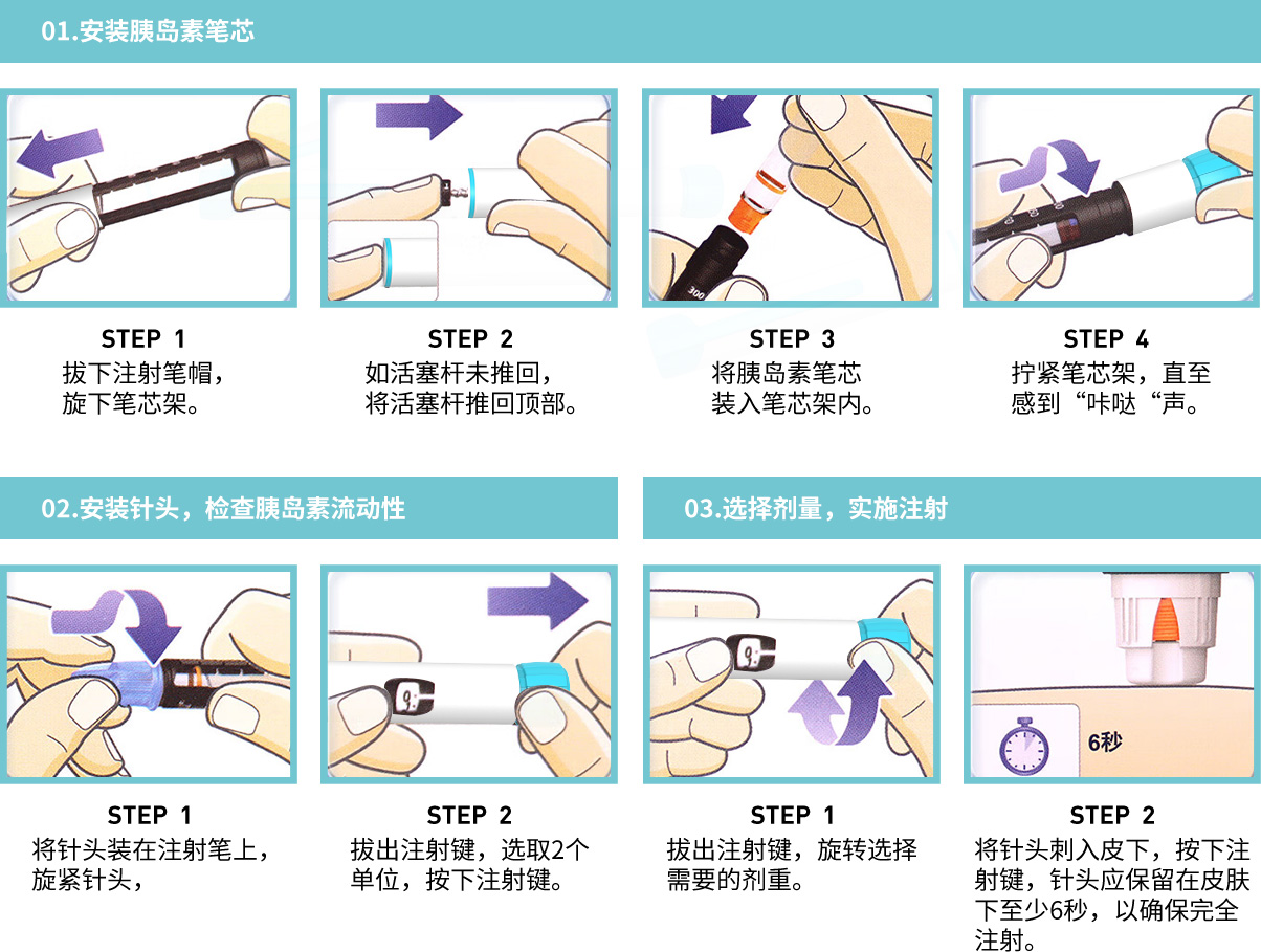 (6)清洁注射部位后,选择合适的注射手法进针(具体进针方式参考《中国糖尿病药物注射技术指南(2016版)》的推荐,或遵照医护专家的要求),将注射按钮按到底后再停留至少10秒,拔出针头;